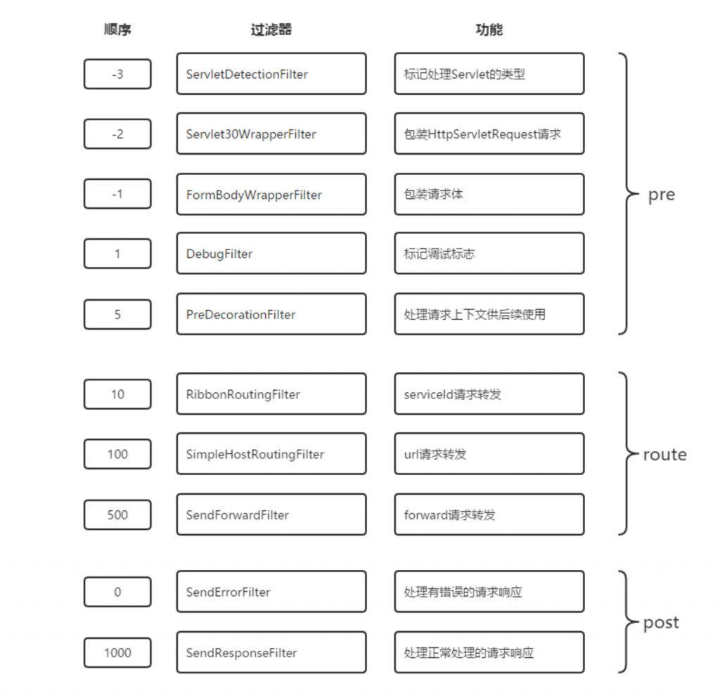 - A2:根据介绍我们知道,zuul中根据作用时机,将过滤器分成了四大type。然后根据过滤器的order依次执行filter。由小执行到大。因此其提供的默认过滤器也符合这些规范。并且他提供的默认过滤器一定会执行。下图就是简单描述默认filter作用和时机。