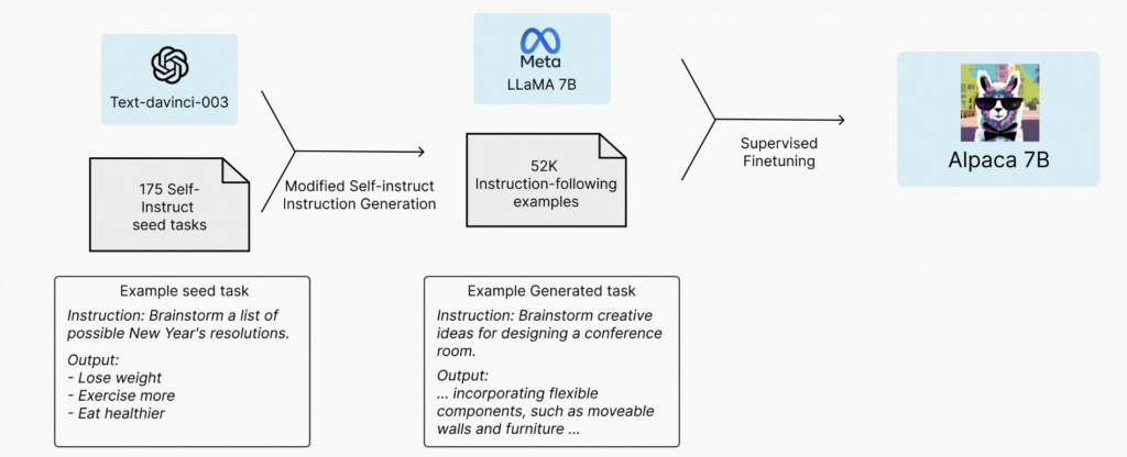 Alpaca是斯坦福在LLaMa-7B的基础上监督微调出来的模型,斯坦福是用OpenAI的Text-davinci-003 API配合self-instruct技术,使用175个提示语种子自动生成了52K条提示-回复的指示数据集,在LLaMa-7B上微调得到的模型,在8张80G的A100上训练了3小时。