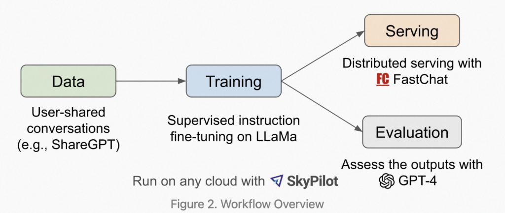 Vicuna是在LLaMa-13B的基础上使用监督数据微调得到的模型,数据集来自于ShareGPT.com 产生的用户对话数据,共70K条。使用Pytorch FSDP在8张A100上训练了一天。相较于Alpaca,Vicuna在训练中将序列长度由512扩展到了2048,并且通过梯度检测和flash attention来解决内存问题;调整训练损失考虑多轮对话,并仅根据模型的输出进行微调。通过GPT4来打分评测,Vicuna可以达到ChatGPT 90%的效果。并且还提供了可调用的分布式聊天服务FastChat。