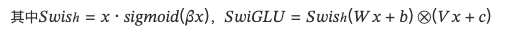 LLaMa使用SwiGLU激活函数替代了原有的ReLU激活函数。SwiGLU是Swish和GLU两个函数的结合