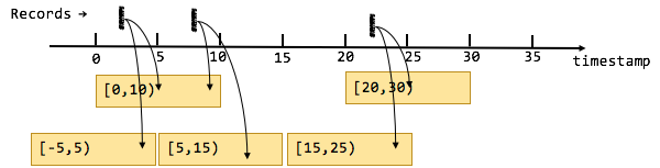 如上图所示横轴代表时间戳(为简化问题,时间戳从0开始),第一条record会被分配到[-5,5)和[0,10)两个窗口中,当系统时间到5时,就会计算[-5,5)窗口中的数据,并将结果发送出去,最后清空窗口中的数据,释放该窗口资源。