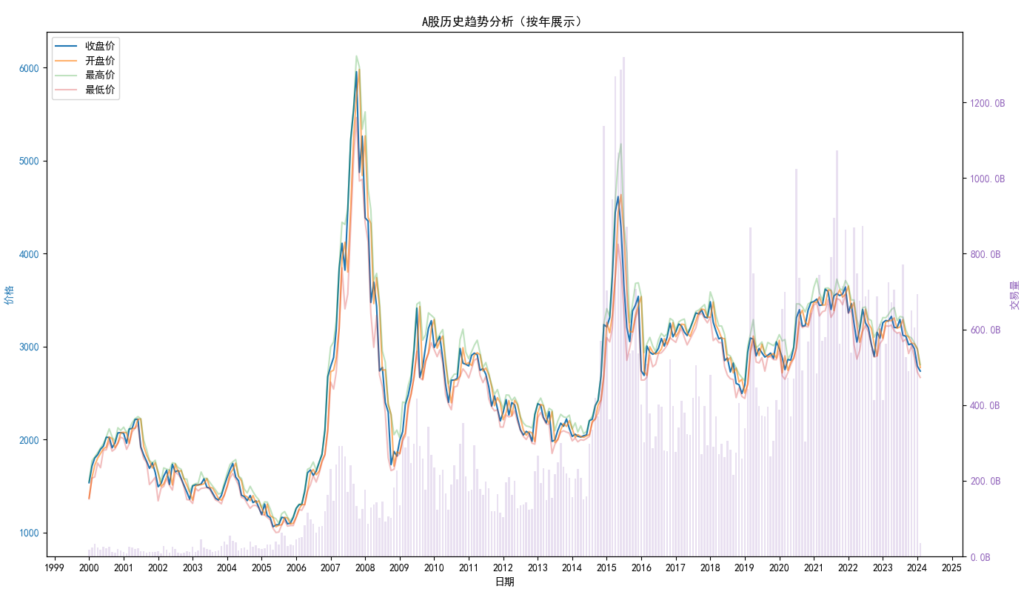ax2.bar(data['日期'], data['交易量数值'], width=20, alpha=0.2, color='tab:purple')