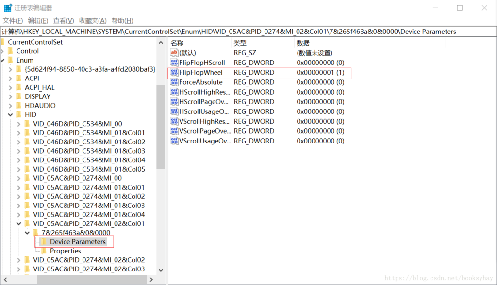 3,打开注册表编辑器,找到: HKEY_LOCAL_MACHINE\SYSTEM\CurrentControlSet\Enum\HID\VID_???\VID_???\Device Parameters下面的“FlipFlopWheel子键,将其值由0改为1.其中VID_???即是上一步记录的设备序号。