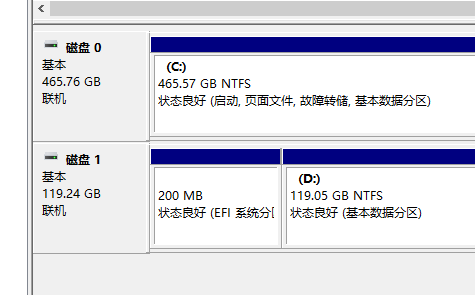 我感觉不对劲了,我又帮D盘对应的磁盘插回去了,然后电脑就能正常开机了,然后我打开了磁盘管理器看了一眼: