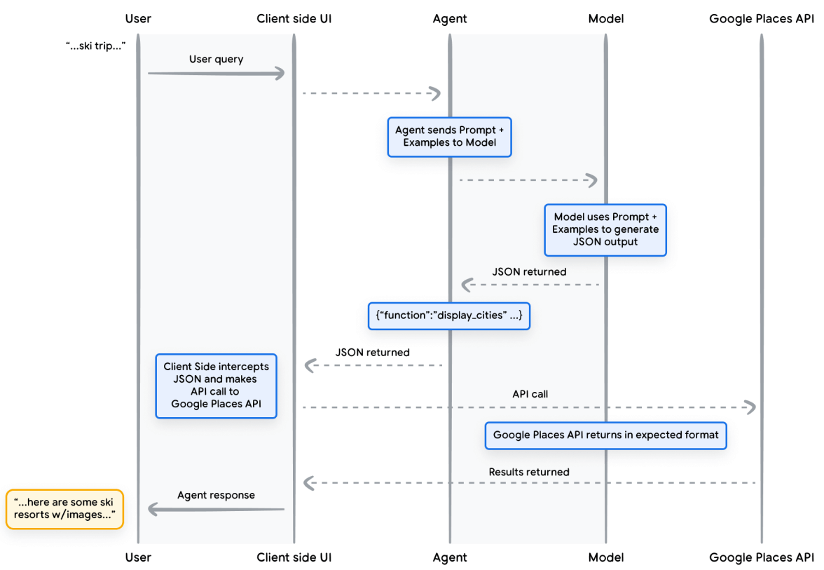 与以上类似,我们可以对生成式 AI 模型进行训练, 让它们能使用工具来在现实世界中获取实时信息或给出行动建议。 例如,